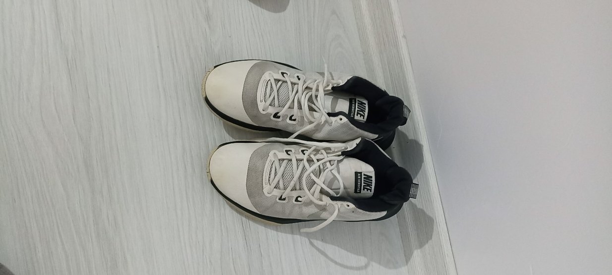 Nike basketbol ayakkabısı, beyaz ve gri renklerde, bağcıklı tasarıma ve kauçuk tabana sahiptir, sportif sokak giyimi için uygundur.