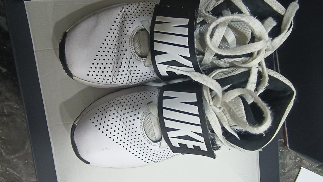 Nike beyaz ve gri renklerde, baskılı desenli ve velcro bantlı basketbol ayakkabıları. Kauçuk tabanlı, sokak stili ve sportif kullanıma uygun.