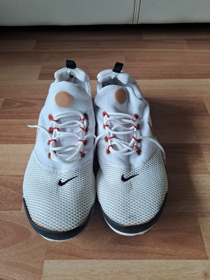 Nike beyaz ve gri renkli spor ayakkabılar, nefes alabilen file kumaş ve kırmızı bağcık detayları ile sokak stilini yansıtıyor. Rahat athleisure kullanıma uygun.kusurlari gosterilmistir iade yoktur 43 numaradir