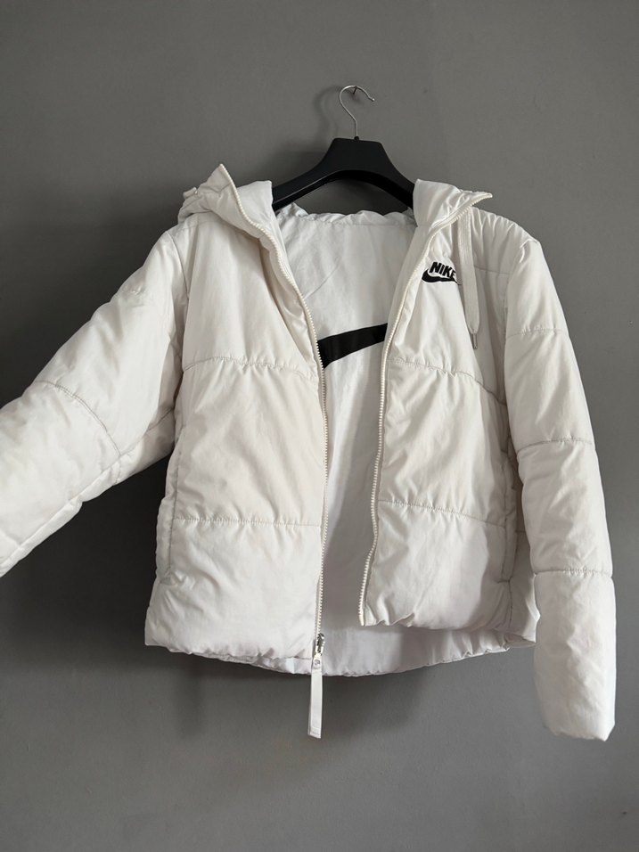 Yumuşak ve sıcak kumaştan yapılmış, beyaz kadın kış montu, kapüşonlu, çift taraflı giyilebilen nike mont isterseniz ölçülerini verebilirim çift taraflı olduğu için etiket beden bilgisi yok