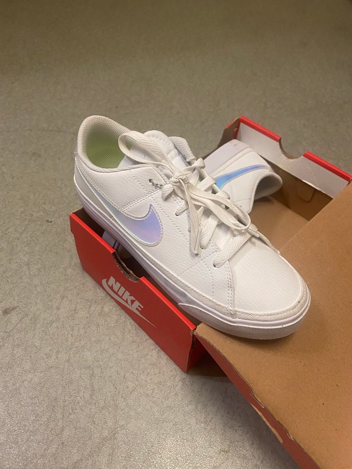 Nike beyaz kadın spor ayakkabısı, blok topuk ve cırt cırtlı, spor sokak stili için tasarlandı. Kauçuk tabanlı ve baskılı detaylı.