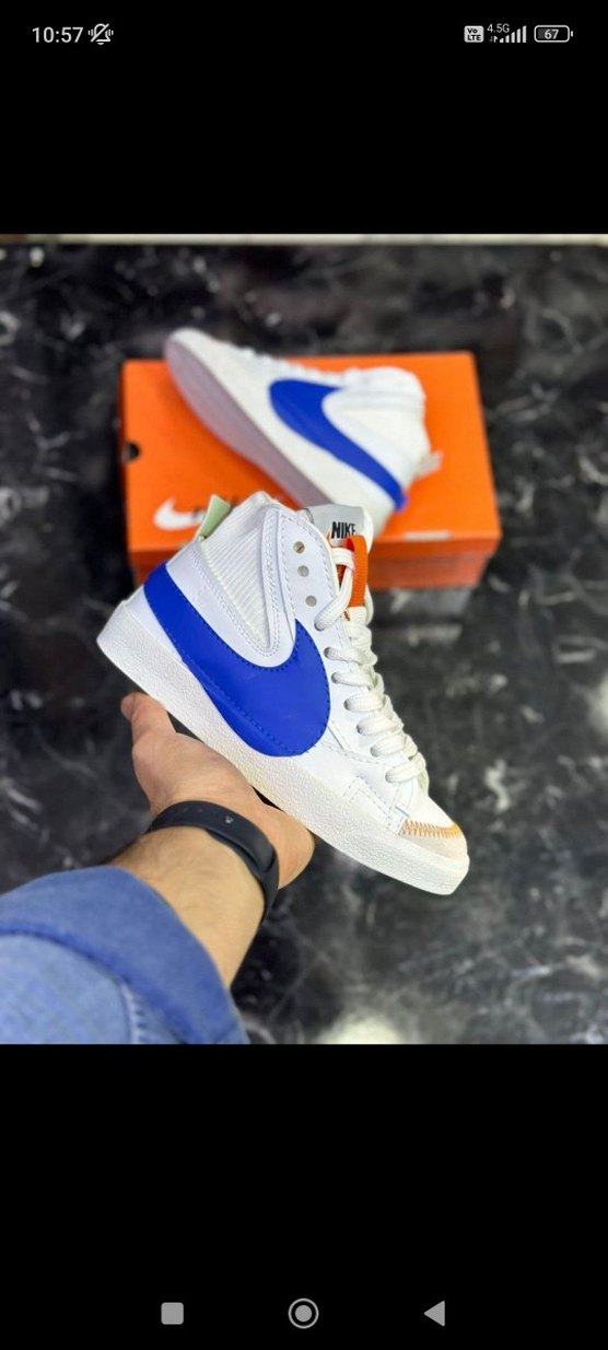 Nike marka beyaz tabanlı, canlı mavi swoosh detaylı, yüksek bilekli, kauçuk tabanlı ve bağcıklı spor ayakkabılar.