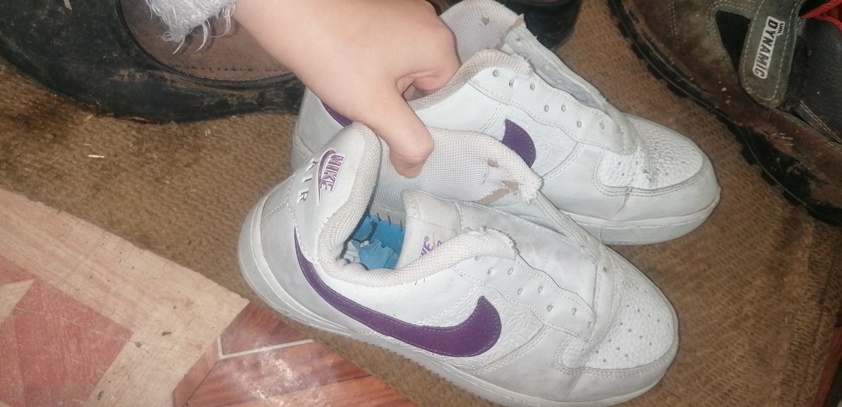 Beyaz ve mor detaylı Nike kadın spor ayakkabısı, kauçuk tabanlı ve cırt cırtlı. Spor ve sokak stiline uygun şık tasarım.