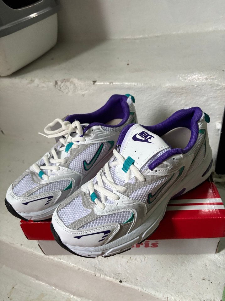 Nike marka beyaz spor ayakkabı, mor ve turkuaz pastel detaylara sahip, bağcıklı ve sivri topuklu tasarımıyla şık bir sokak stili sunar. ♀️