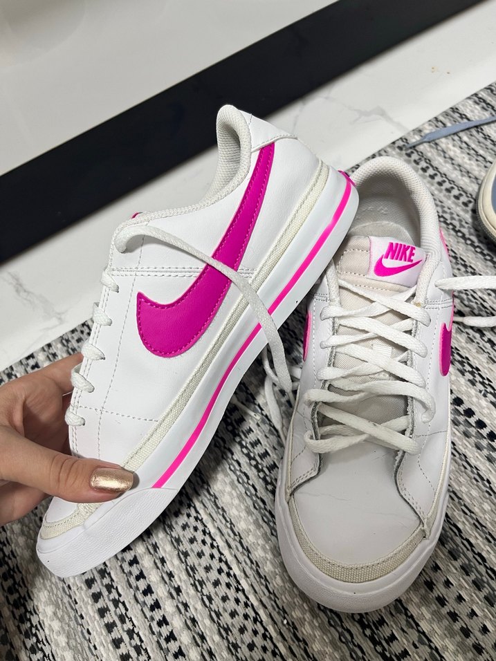 Biraz kullanıldı teklif gönderebilirsiniz 38 numara Nike beyaz ve pembe detaylı, bağcıklı, kauçuk tabanlı spor ayakkabı. Sokak stili ve spor için uygundur.
