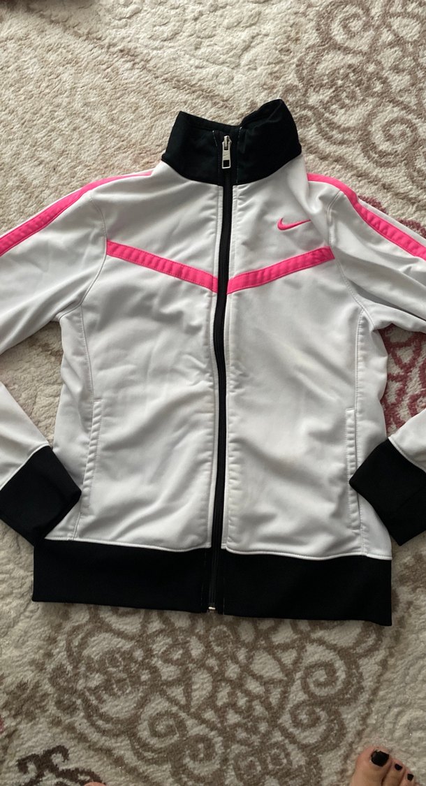 Nike markalı, beyaz-pembe renkli, uzun kollu, yüksek yakalı ve fermuarlı kadın spor ceketi. Yumuşak ve sıcak kumaştan, spor ve günlük kullanım için uygun.