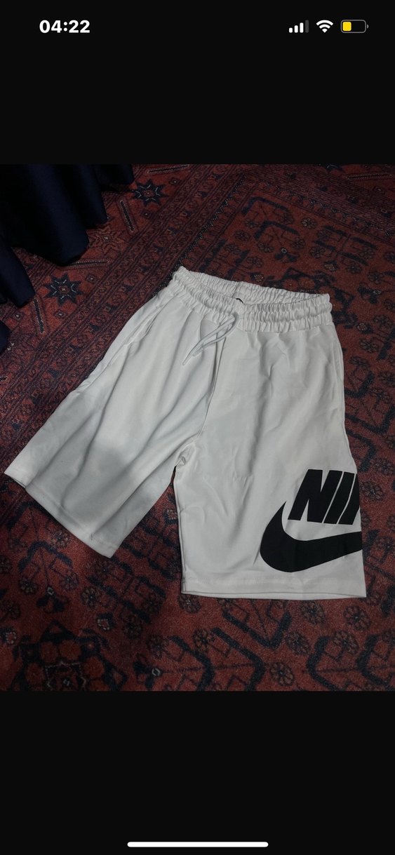 Nike markalı beyaz, rahat kesim erkek şort. Sentetik kumaştan üretilmiş, kısa boylu ve büyük siyah logo detaylıdır. Spor ve gündelik kullanım için uygundur. S-M-XL-XXL bedenleri mevcut