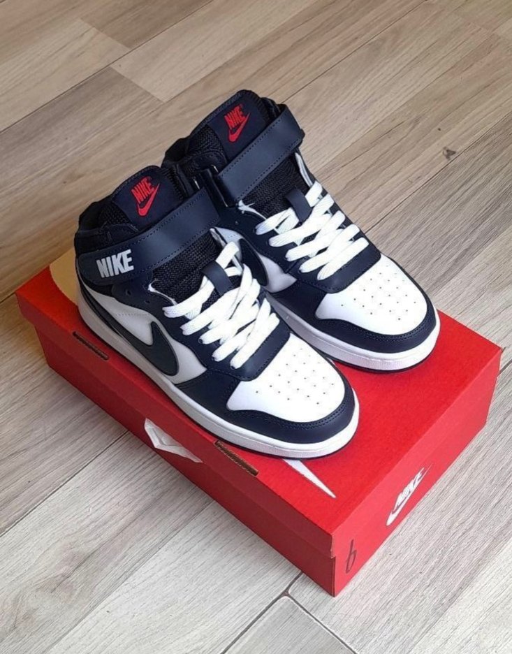 Nike marka, dolgu topuklu ve cırt cırtlı beyaz siyah spor ayakkabılar. Kauçuk tabanlı, koyu renk baskılı tasarım, spor ve günlük kullanıma uygun.