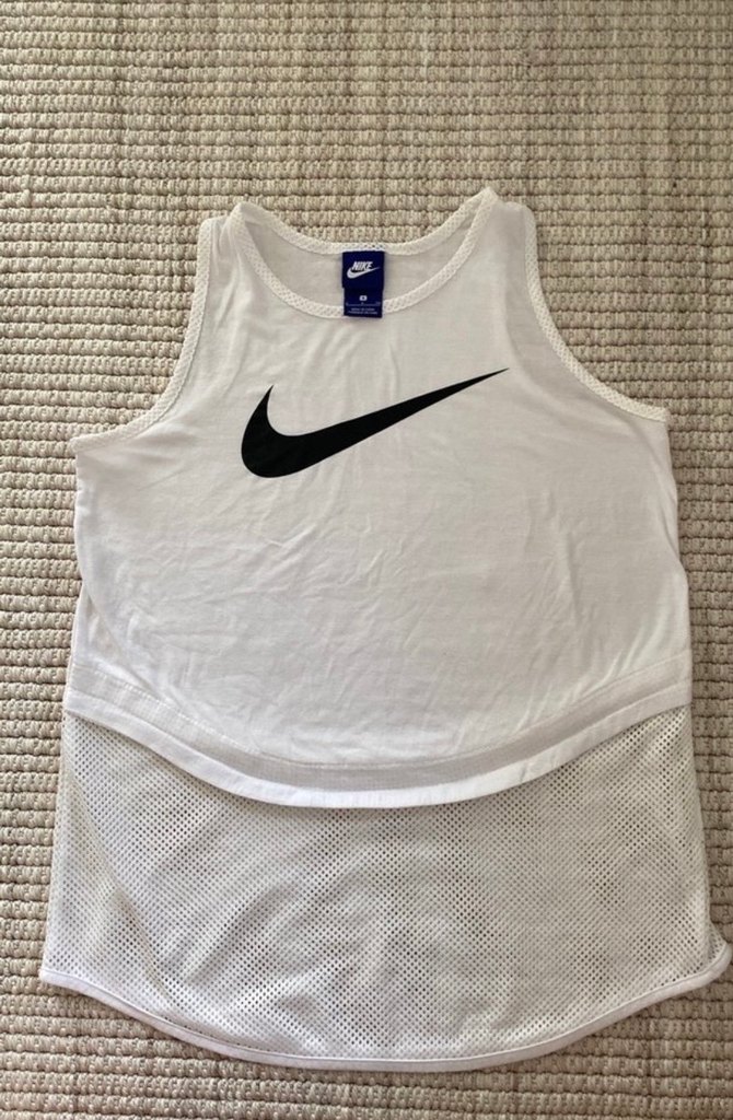 Nike beyaz spor atlet, kolsuz ve yuvarlak yakalıdır. Nefes alabilen sentetik kumaştan üretilmiş, siyah klasik logo ile sade ve rahat bir görünüme sahiptir. ♀️