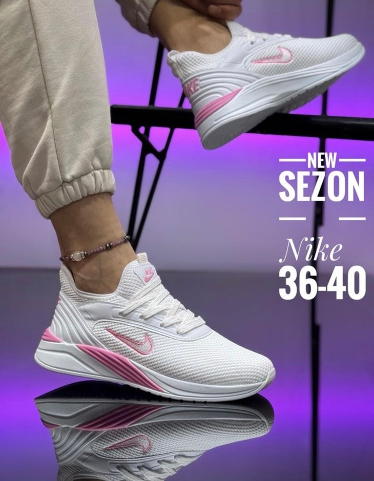 Nike beyaz spor ayakkabı, bağcıklı ve açık pembe detaylı, kauçuk tabanlıdır. 36-40 numara arası, spor ve sokak stili için uygundur.