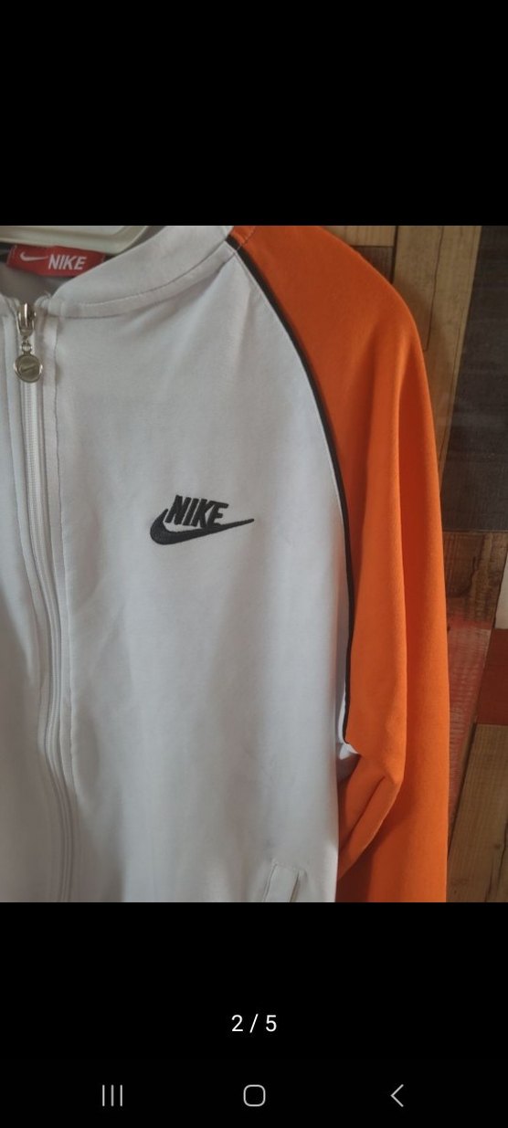 Nike marka, parlak beyaz ve turuncu renklerde, fermuarlı, uzun kollu, bisiklet yaka, baskılı kadın eşofman üstü. Spor için uygun, sentetik kumaştan yapılmıştır. ♀️