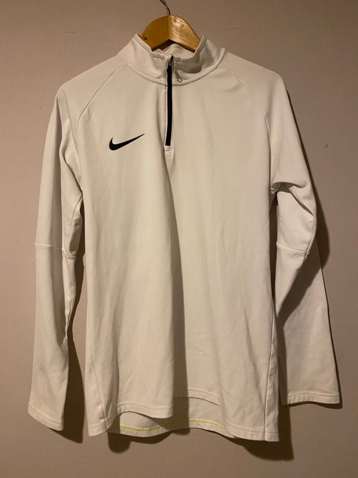 Nike markalı, uzun kollu ve yarım fermuarlı beyaz sweatshirt. İnce kesim ve sentetik kumaştan üretilmiştir, spora koşuya, günlük ve sokak tarzına uygundur. ⚡