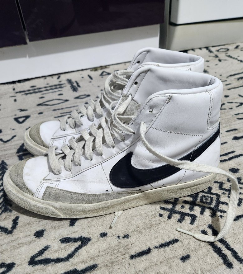 Nike beyaz yüksek spor ayakkabılar, bağcıklı tasarımı ve kauçuk tabanıyla sportif konforu trend sokak stiline taşıyor.beyaz gri tonlarında fotoda belirttim sadece bitanesinin kenarında soyulma olmus başka hiçbir problemi yoktur guncel fiyatini ekledim fotolarda bizde o siteden geçen sezon almistik