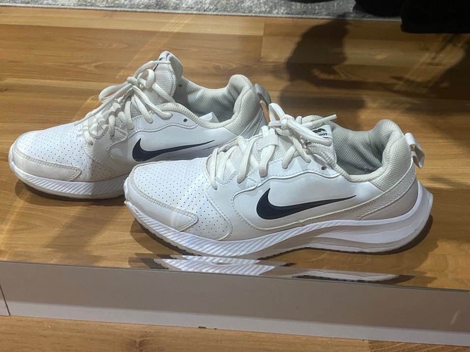 Nike beyaz yüksek topuklu spor ayakkabı, bağcıklı ve kauçuk tabanlıdır. Defolarını fotoğrafta belirttim orijinaldir.