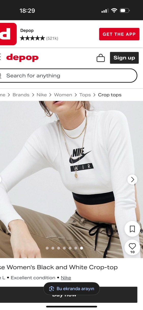 Nike beyaz crop top, yüksek yakalı ve uzun kollu, pamuklu kumaştan. Trendy ve rahat şıklık sunar. Az kullanıldı orijinaldir