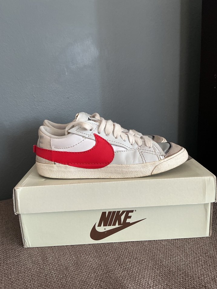 Nike erkekspor ayakkabıları, beyaz ve gri malzeme üzerinde kırmızı swoosh ile düz kauçuk tabana sahip, spor ve sokak giyimi için uygundur. Desensiz ve zahmetsiz şıklık sunar.ürün orijinaldir az giyildi