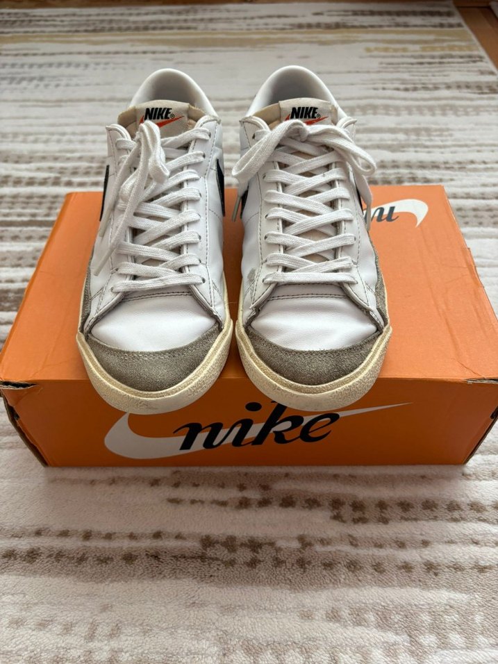 Nike blazer low 77 vintage modeli 41 numara erkek ayakkabı Sol tekinde içe bakan kısımda ve boğaz kısmında derinin beyaz boyası soyulmuştur