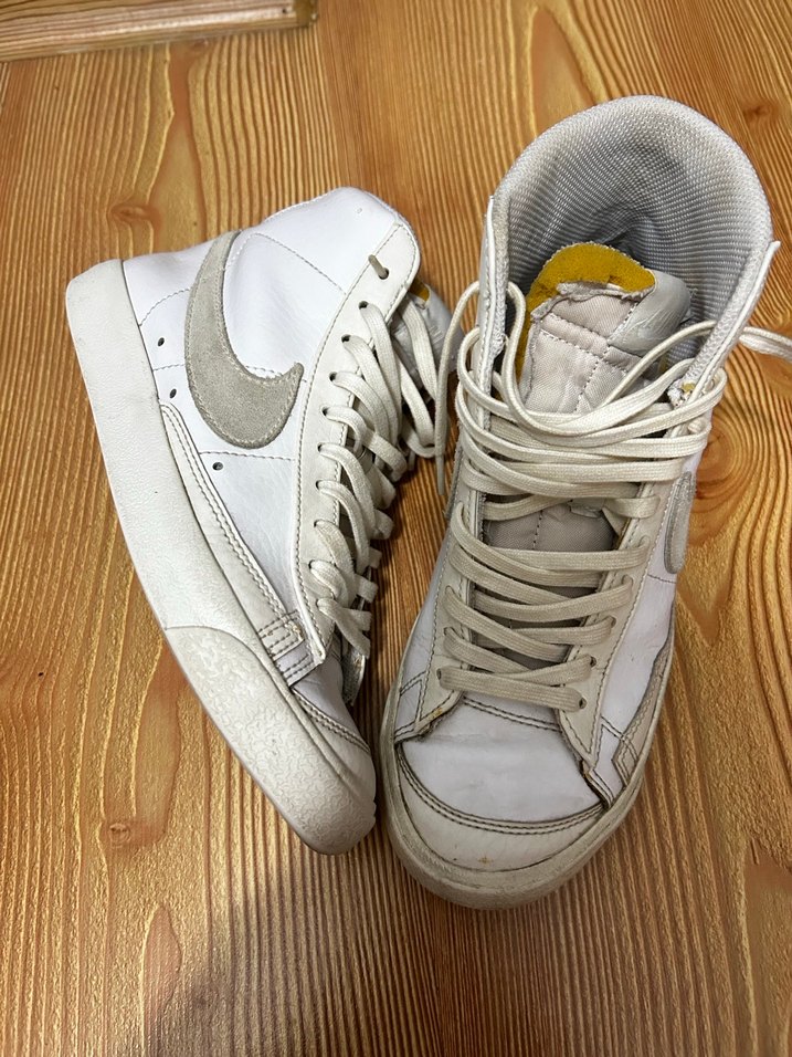 Orijinal Nike Blazer Mid model, 36.5 numara. Beyaz-bej renkte. Orta düzey kullanım izleri var, güzel durumda. Detaylı fotoğraflar eklenmiştir. Fiyat konusunda yardımcı olabilirim