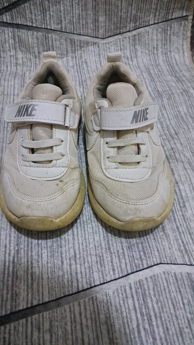 Nike erkek çocuk beyaz spor ayakkabı, gri detaylı, cırt cırtlı ve kauçuk tabanlıdır. Düz, desen içermeyen sokak stili ayakkabıdır. Cok hafif bir ayakkabi bir kac kez kullandi ,göründüğü gibidir.yirtik vs.yoktur.Rengi beyaz ama yagmurda oynadığı icin sarı gibi görünüyor yıkayınca çıkar muhtemelen.
