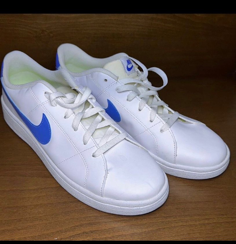 Mavi detaylı beyaz Nike spor ayakkabısı, düz kauçuk tabanlı ve bağcıklı, günlük sokak stili için uygun.