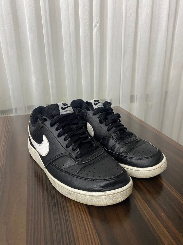 Siyah Nike bağcıklı spor ayakkabılar, beyaz logo ve kauçuk tabanlı. Spor ve sokak tarzını şık bir şekilde birleştirir.