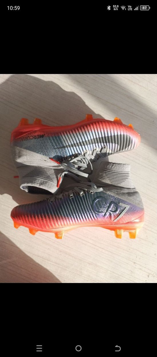 Nike CR7 erkek futbol ayakkabısı, gri renkli, baskılı desenli ve Velcro özellikli. Kauçuk tabanlı, çağdaş ve sportif tarzlar için uygun. ⚽