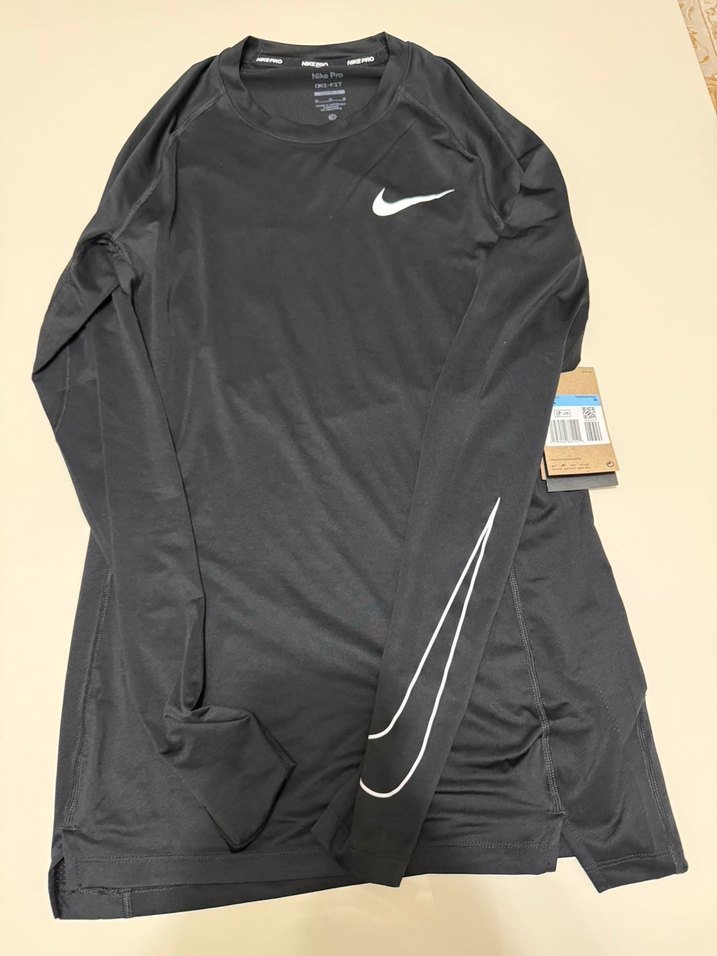 Nike markalı, siyah renkli, uzun kollu, elastik sentetik kumaştan yapılmış, dar kesim erkek spor tişörtü. M beden sıfır orjinal etiketli ürün