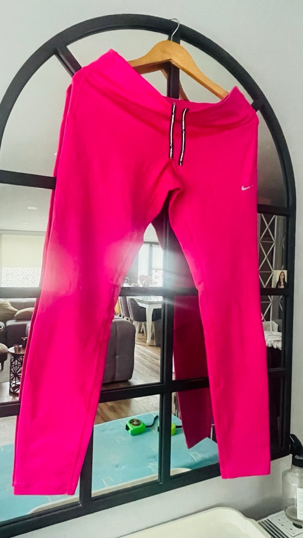 Nike Nike dri- fit pembe kadın spor tayt. Münükntasarım detayları kumaştan, elastik bel bantlı, pembe renkli, spor ve sokak stiline uygun, normal boy tayt. Desensiz ve vücuda oturan kesim. Mevcuttur. Ürün sıfır kullanılmamıştır. Renk bu kadar fosforlu değil daha natural bir pembe