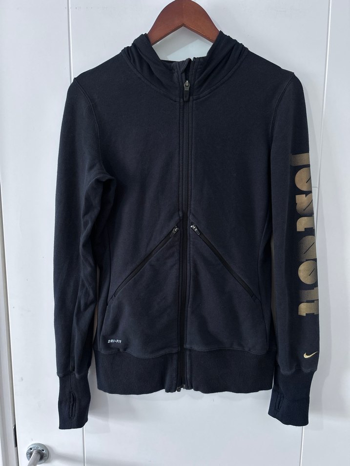 Nike marka, önden tam fermuarlı, eldiven kol(parmak geçmeli), ön fermuar cepli, drifit özellikli, kapüşonlu hoodie üst. Orijinal ürün, kod ve etiket görsellerine yer verildi. Kol kısmı altın ton yazılı ve logolu. Temiz ve hatasız. #nike #hırka #drifit #spor #fitness #koşu #hoodie
