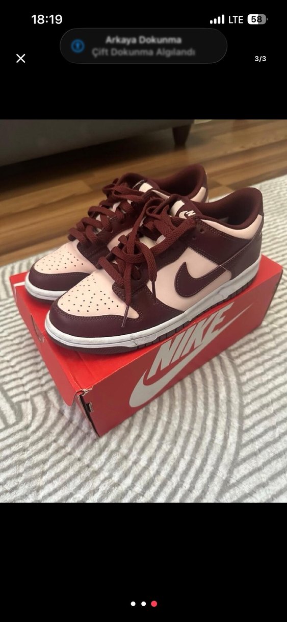 Nike kadın spor ayakkabısı, kahverengi ve pembe tonlarında, bağcıklı ve düz tabanlıdır. Dayanıklı kauçuk malzeme ve baskılı detaylarıyla rahat ve şık bir görünüm sunar. 39.5 numaradır. Deneme amaçlı giydim iade süresini kaçırdım 39 numara giyene olur
