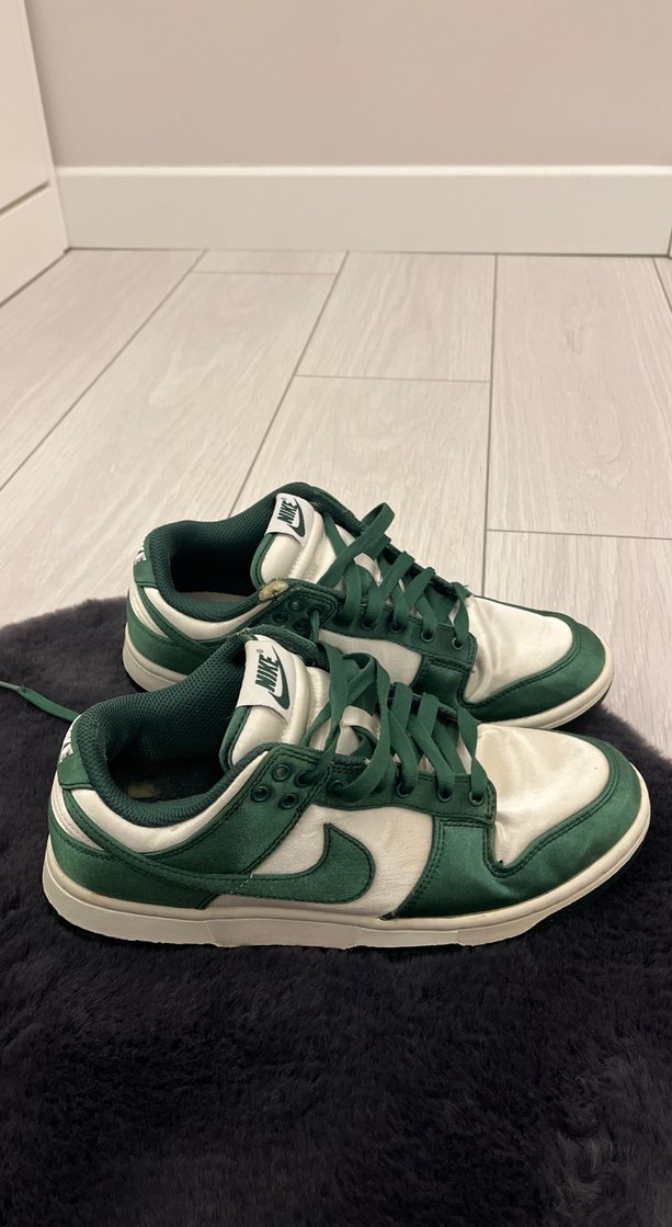 Koyu yeşil süet Nike spor ayakkabılar, düz tabanlı ve kürk detaylıdır. Spor ve günlük sokak stiline uygundur. Rahat ve şık.