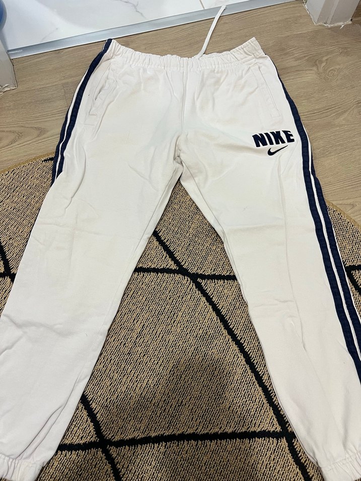 Nike markalı, pamuklu, beyaz renkli erkek eşofman altı. Siyah yan şeritler ve bağcıklı beli ile rahat ve geniş kesim sunar.