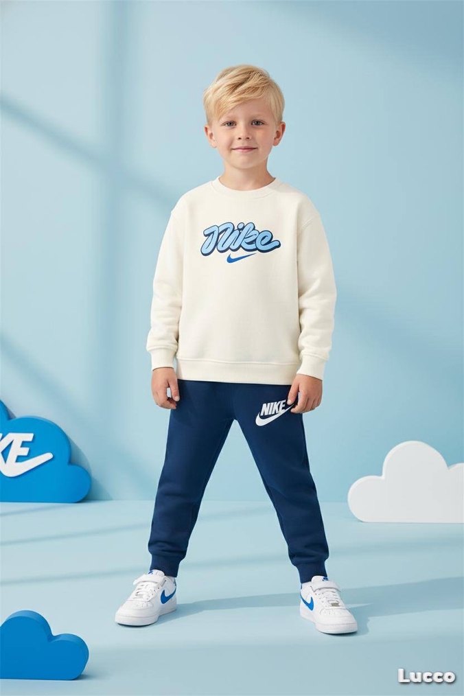 ▫️2-3 / 3-4 / 4-5 / 5-6 / 7-8 ▪️%100 COTTON Nike erkek çocuk beyaz sweatshirt ve lacivert baskılı eşofman altı, rahat kesim ve yumuşak kumaşla günlük sokak stiline uygun.