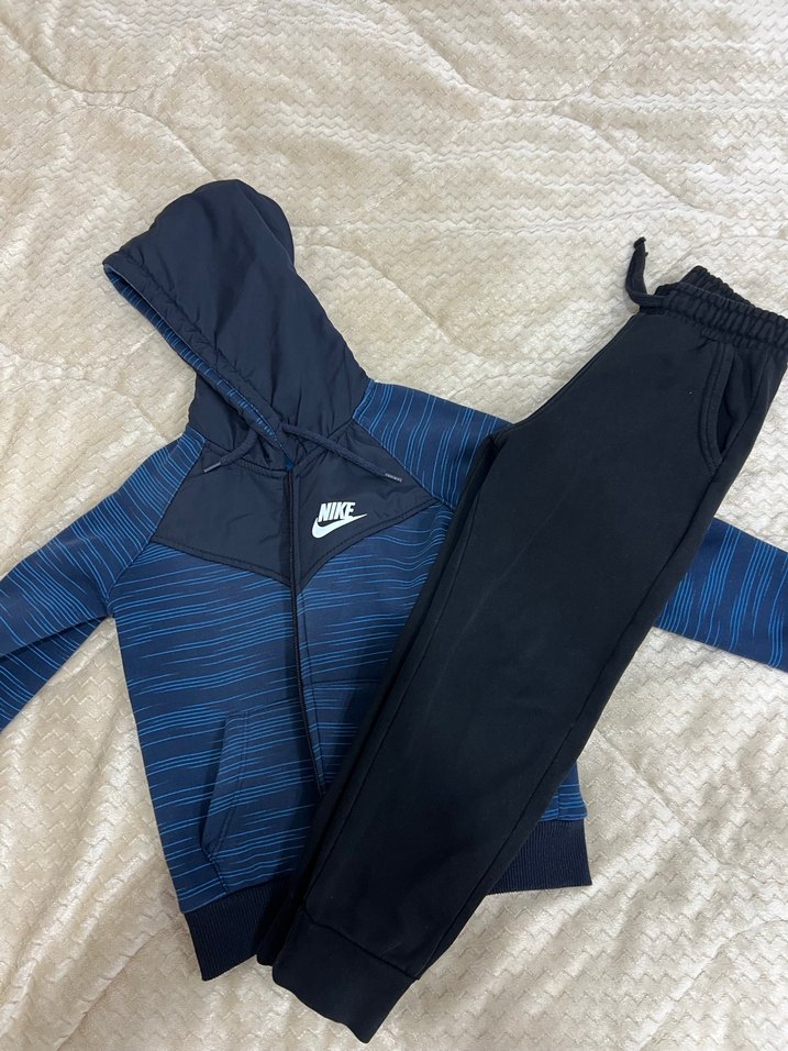 Nike marka, koyu mavi kapüşonlu fermuarlı sweatshirt ve siyah düz eşofman altından oluşan, fitted kesim erkek çocuk eşofman takımı. Trendy casual tarz için uygun.