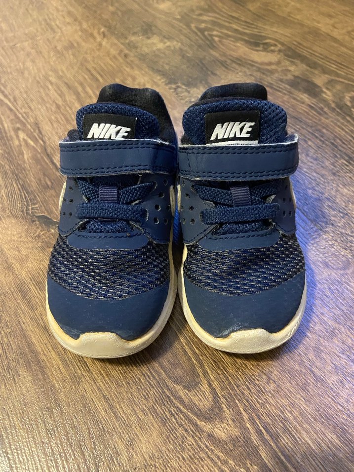 Nike marka, lacivert renk, cırt cırtlı ve kauçuk tabanlı erkek çocuk spor ayakkabısı. Düz ve sokak tarzı şık tasarım.