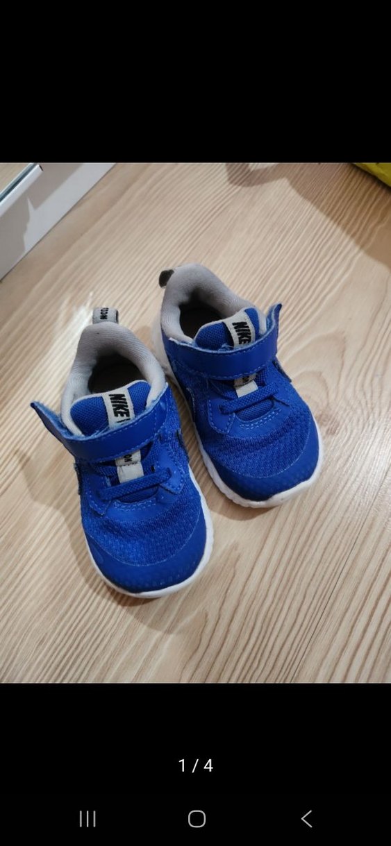 Nike marka, mavi renkte, Velcro bantlı, kauçuk tabanlı, sade ve renkli erkek çocuk spor ayakkabısı.