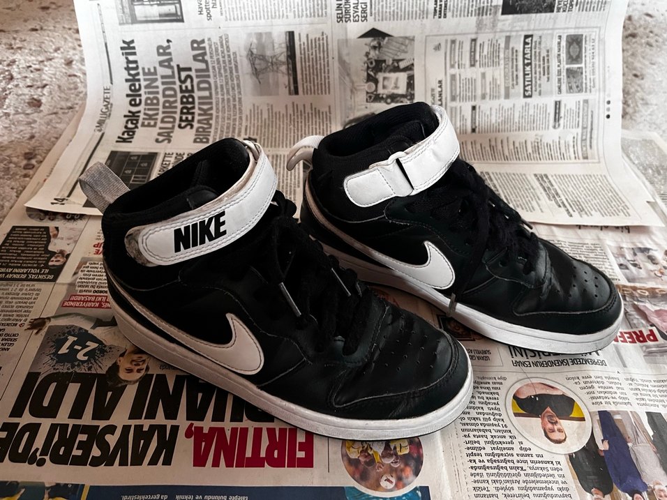 Nike erkek çocuk siyah spor ayakkabı, baskılı desen ve kolay kapanan cırt cırtlı bant ile. Dayanıklı kauçuk tabanlı, sokak stili için uygun.