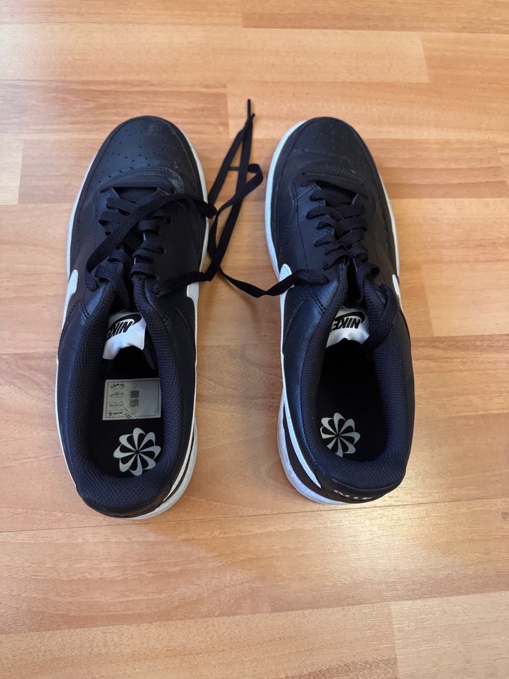 Siyah Nike spor ayakkabılar, kauçuk taban ve stilettolu topuk tasarımı ile spor ve şık günlük kullanım için uygundur. 46 numara