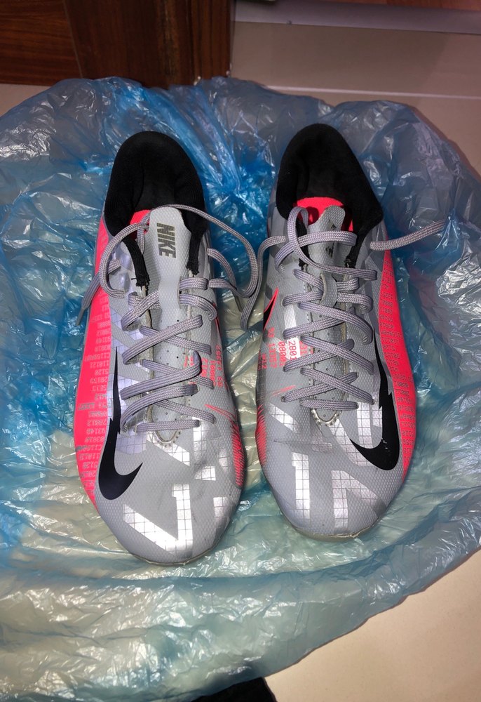 Nike erkek futbol ayakkabısı, gri tie-dye desenli, kauçuk tabanlı ve bağcıklı, Velcro bantlı. Sokak stili için uygun. ⚽ çocuk erkek krampon 36.5 numaralı Hiçbir hasarı yok olmadığı için satıyorum