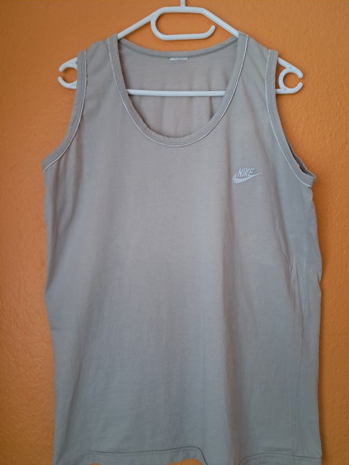 Nike marka erkek atlet, gri-bej renkte, salaş kesim ve normal boyda. Göğüste küçük Nike logosu bulunuyor. boyu 72 cm