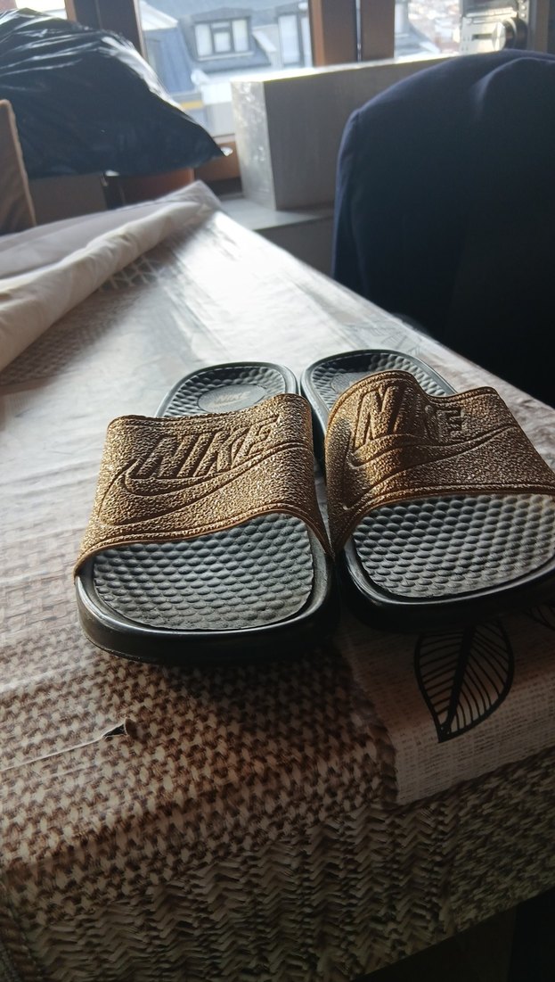 Nike erkek terlik, parlak kahverengi yılan desenli kemer ve dokulu siyah taban ile sokak stili için uygun.