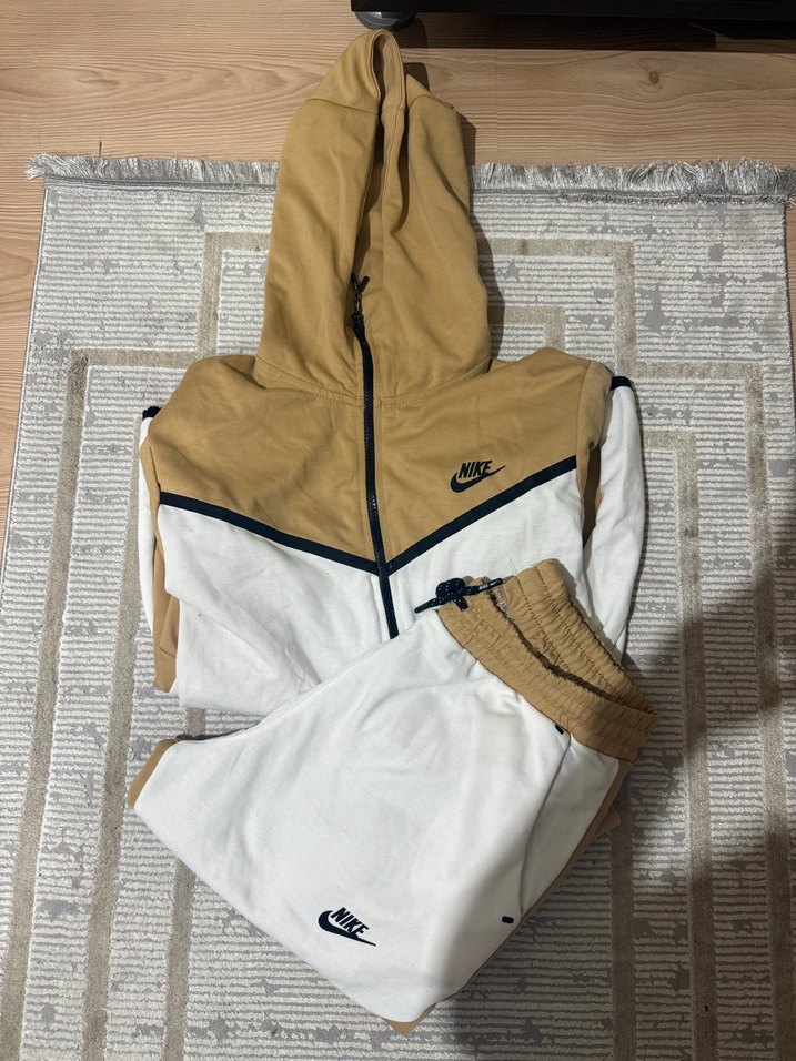 Nike marka, fermuarlı kapüşonlu ve vücuda oturan kesime sahip beyaz-bej erkek eşofman takımı. Yumuşak sentetik kumaştan, günlük kullanım için uygun.