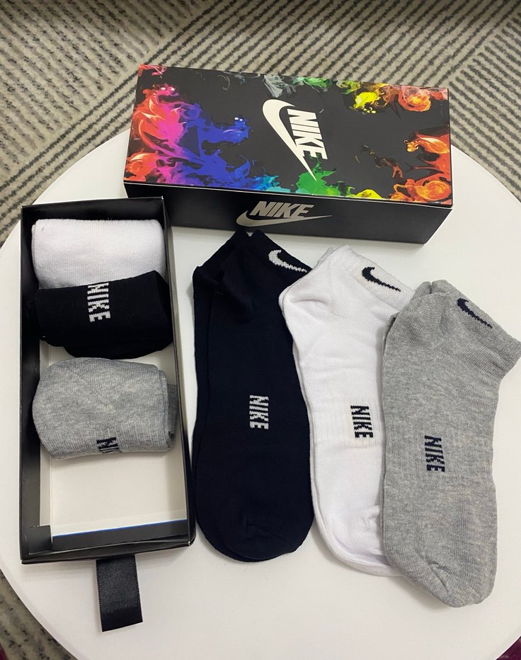 Nike erkekler için gri, siyah ve beyaz renklerde kısa, vücuda oturan, baskılı logolu atletik çorap seti. Renkli kutuda.