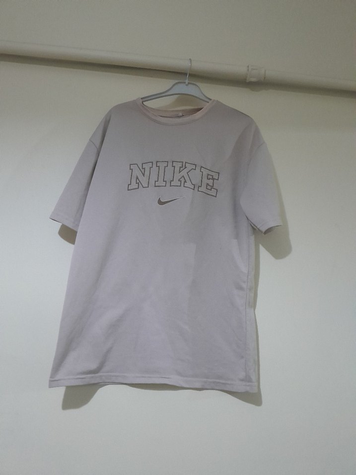 Nike marka, kısa kollu, beyaz renkli, bol kesim erkek tişört. İpeksi kumaştan üretilmiş, baskılı logo ve rahat kesimiyle günlük kullanıma uygundur. krem renkli di iki kol arası 50 boy 68 santim