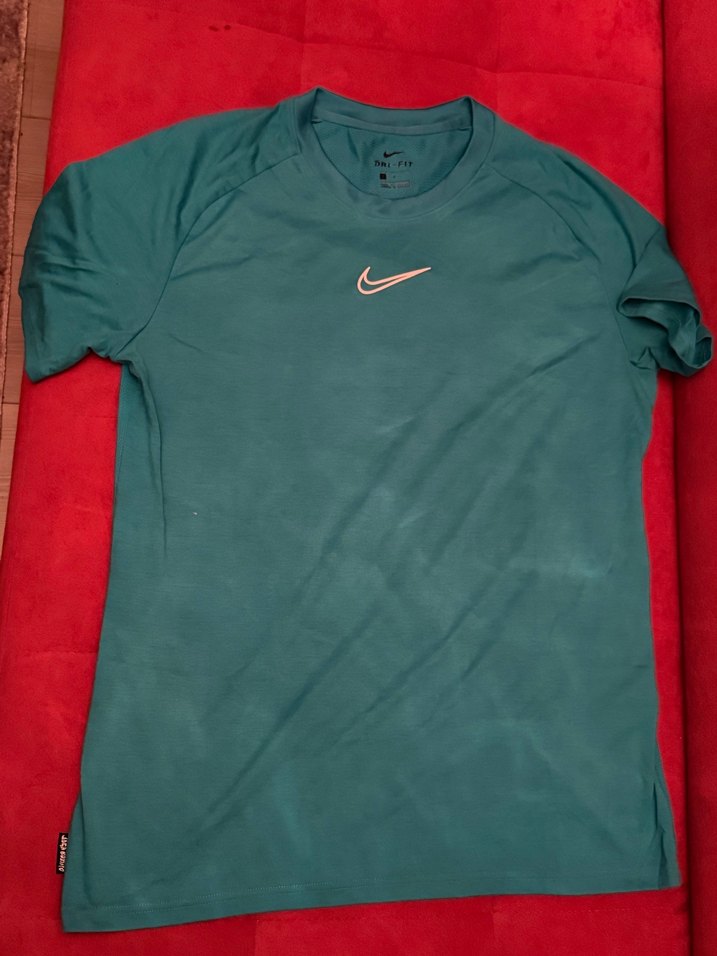 Nike marka, koyu yeşil renkli, kısa kollu ve bisiklet yakalı, sentetik kumaştan yapılmış erkek tişörtü. Spor ve günlük kullanım için uygun. ♂️