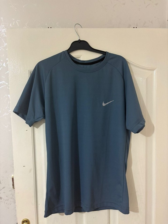 Nike marka, kısa kollu, yuvarlak yaka ve bol kesim mavi tişört. İpeksi kumaştan üretilmiş, spor ve günlük kullanım için rahat ve sade tasarım sunar. ♂️