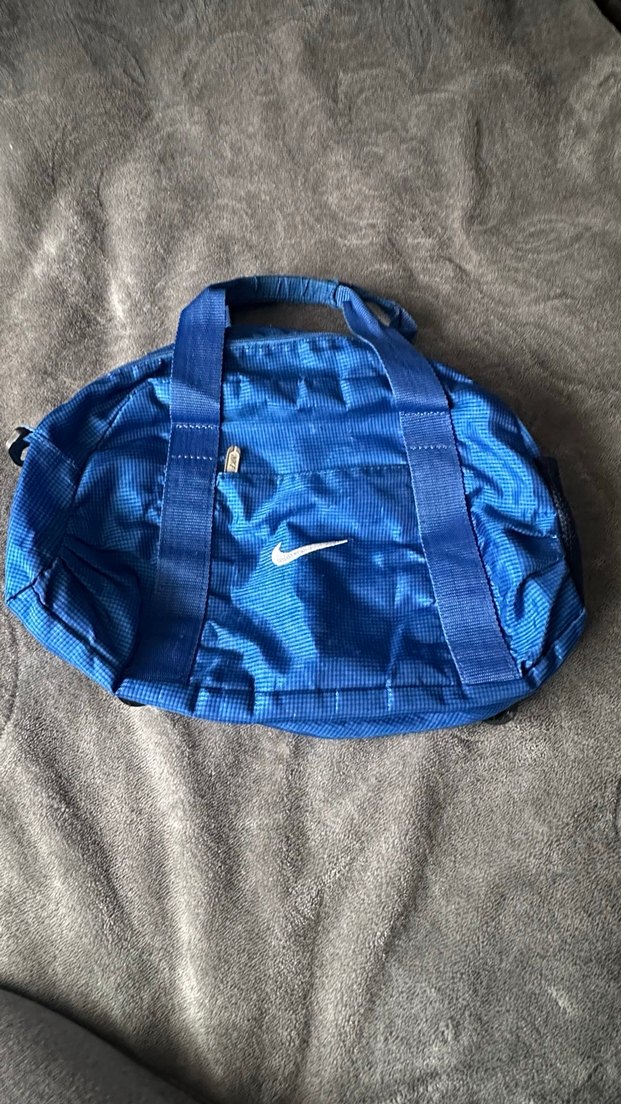 Nike marka erkek mavi spor çantası, fermuarlı ana bölme ve sade tasarıma sahip, streetwear ve athleisure tarzları için uygun.