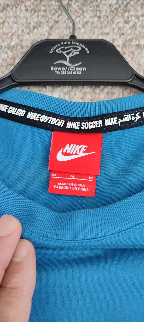Nike erkek tişörtü, mavi renkte ve çok dilli Nike futbol yazılı yaka şeridine sahip. Kırmızı Nike rozeti bulunur, Çin'de üretilmiştir. ⚽