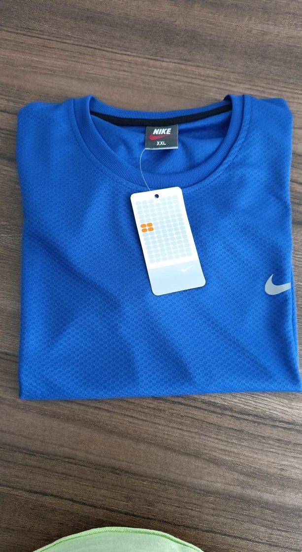 Nike muadili erkek tişörtü, parlak mavi renkte, yuvarlak yaka ve kısa kolludur. Dar kesim, yumuşak sentetik kumaştan üretilmiştir. XXL beden.