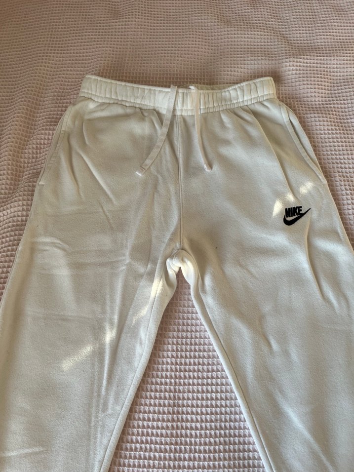 Nike beyaz, rahat kesim, normal boy midi eşofman altı. Sentetik kumaştan, gri logo detaylı, sportif ve şık bir tarz sunar.